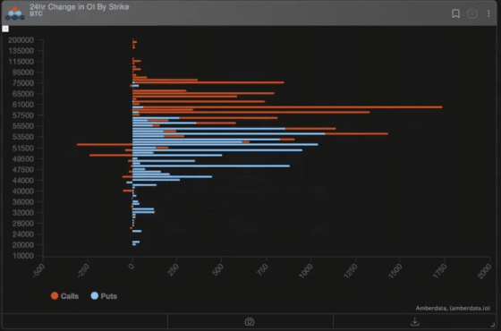 코인데스크는 27일(현지시간) 앰버데이터를 인용, 지난 24시간 동안 행사가격이 5만8000 달러, 6만 달러, 그리고 6만 달러 이상인 콜옵션의 미결제약정이 증가했다고 보도했다.