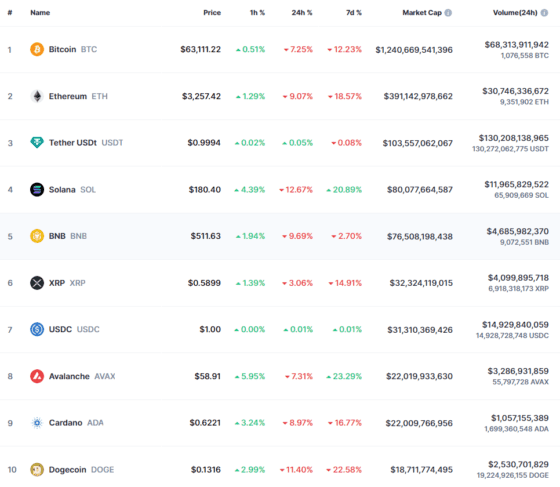 이 시간 비트코인은 6만3111.22 달러로 24시간 전 대비 7.25% 내렸다. 앞서 6만2478.44 달러의 저점을 기록했다. 비트코인은 지난주 7만3750.07 달러의 사상 최고가를 기록한 뒤 조정을 겪고 있다. 이더리움은 3257.42 달러로 9.07% 하락했다. 장중 저점은 3202.16 달러로 기록됐다. 이더리움은 1주일 전과 비교하면 18% 넘게 하락했다. 이더리움의 사상 최고가는 2021년 11월 16일 4891.70 달러다.