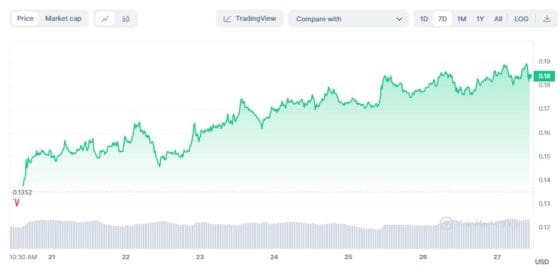 도지코인 주소의 급증은 시장 가격의 상승 모멘텀과 일치한다. 코인마켓캡에서 주요 종목 대부분 하락한 가운데 도지코인은 지난 24시간 동안 3.16% 오르고, 일주일 동안 36.84% 급등했다.