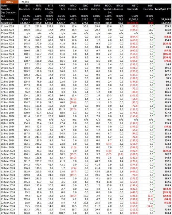 그레이스케일 비트코인 트러스트(GBTC)에서 거의 3억 달러가 빠져나갔지만 블랙록 비트코인 ETF(IBIT)의 3억2380만 달러 순유입으로 상쇄됐다. 아크 인베스트의 비트코인 ETF(ARKB)도 2억 달러 넘는 순유입을 기록했다. ARKB의 수요일 순유입은 출시 후 최대 규모다. 반면 피델리티 비트코인 ETF(FBTC)의 전일 순유입은 150만 달러로 출시 후 최소를 기록했다.
