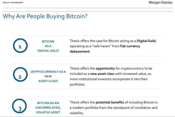 모건스탠리는 비트코인을 사는 첫번째 이유로 “비트코인이 디지털 골드”라고 설명했다. 법정화폐의 가치가 하락할 때 비트코인이 “안전한 피난처”로 작동하는 디지털 골드라고 설명했다.