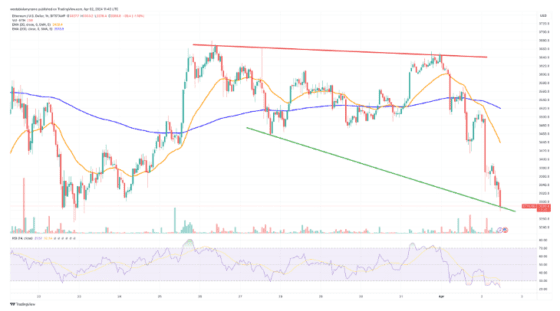 이더리움은 뉴욕 시간 2일 오전 11시 7분 코인마켓캡에서 3305 달러로 24시간 전 대비 5.55% 하락했다. 이날 장중 저점은 3239.36 달러로 기록됐다.
