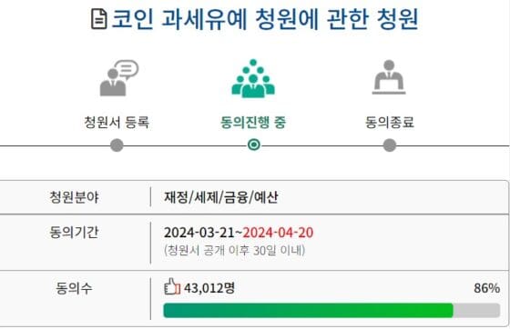 [블록미디어] 암호화폐(코인) 과세를 유예해 달라는 국민동의청원에 대한 동의가 4만3000 명을 돌파했다. 오는 20일까지 5만 명이 동의하면 국회는 소관위원회 및 관련 위원회에 회부해 해당 청원을 심사해야 한다.