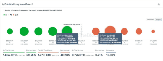 이에 비해 6만9891 달러는 잠재적 저항선으로 비트코인에 상당한 매도 압력을 가할 것으로 분석된다. 이 레벨은 6만9383 달러와 7만108 달러 범위에서 매입한 67만9630 BTC의 평균 가격이다. 이 범위에서 비트코인을 매입한 92만3310 개의 주소가 현재 미실현 손실을 안고 있으며 비트코인이 6만9891 달러에 도달하면 매도로 이어질 가능성이 있다.