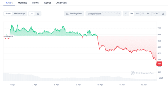 BCH는 뉴욕 시간 12일 오후 1시 45분 코인마켓캡에서 559.30 달러로 24시간 전 대비 8.26% 하락했다. 1주일 전과 비교하면 약 16% 내렸다.