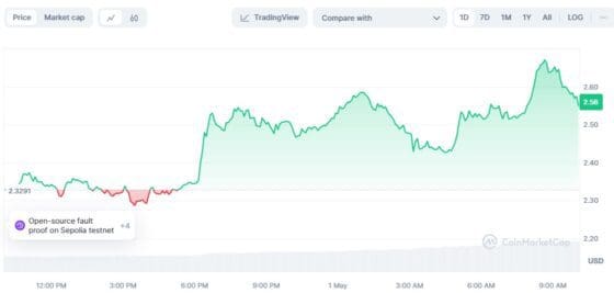 이러한 소식이 전해진 후 암호화폐 시장 전반의 하락세에도 불구하고 코인마켓캡에서 옵티미즘은 뉴욕시간 오전 24시간 전보다 9.8% 오른 2.6 달러에 거래됐다.