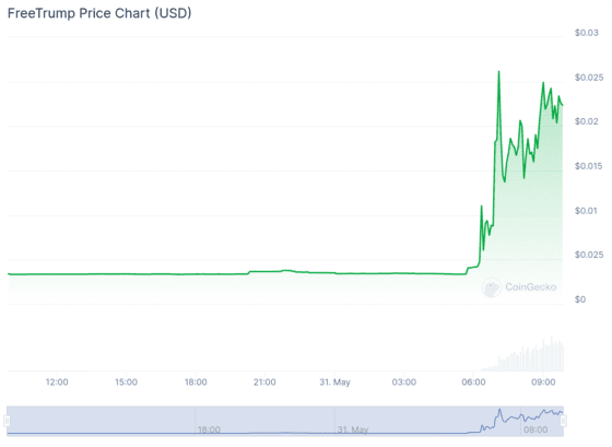 [블록미디어 오진석 기자] 도널드 트럼프 전 대통령이 ‘성 추문 입막음’ 과 관련해 유죄 판결을 받자, 트럼프 밈 코인이 폭등했다. TRUMP 티커를 사용하는 ‘프리트럼프’ 밈 코인은 31일 오전 9시30분 기준 전일대비 550% 상승한 0.02150달러에 거래됐다.