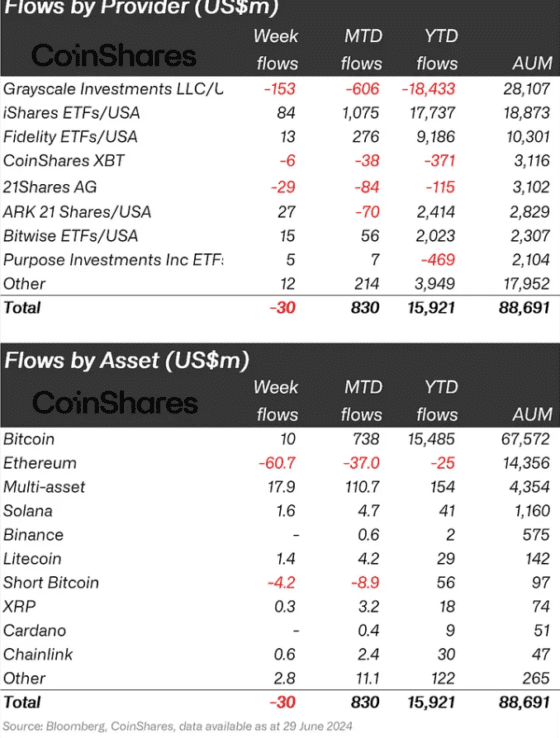 1일(현지 시간) 코인셰어스 주간 보고서에 따르면 6월 29일 기준으로 이전 한 주 동안 전체 암호화폐 펀드에서 3000만 달러가 순유출됐다. 이는 직전 2주간 순유출 규모와 비교해 대폭 축소된 것으로 디지털 자산 시장의 투자 분위기 안정을 시사한다.