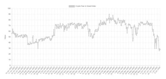 데이터 소스 Alternative.me에서 만든 널리 알려진 이 지수는 비트코인과 기타 주요 암호화폐에 대한 시장 정서를 보여준다.