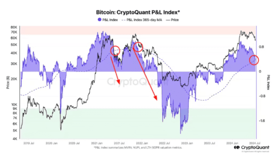 크립토퀀트 데이터에 따르면 비트코인의 이익/손실(P&L) 지수는 365일 이동평균 부근을 맴돌고 있다. 이는 대규모 조정 또는 지속적인 약세장이 시작될 가능성을 시사한다. 2021년 5월, 그리고 11월 이 지수가 이동평균 아래로 내려간 것은 대규모 가격 하락의 전조였다.