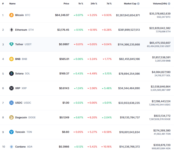 이 시간 비트코인은 코인마켓캡에서 6만4246.97 달러로 24시간 전 대비 3.25% 하락했다. 간밤 저점은 6만3833.25 달러로 기록됐다. 비트코인은 3월 14일 7만3750.07 달러의 사상 최고가를 기록한 뒤 조정을 겪고 있다. 이더리움은 3176.45 달러로 8.19% 내렸다. 앞서 3140.67 달러까지 밀렸다 낙폭을 약간 만회했다. 이더리움의 사상 최고가는 2021년 11월 16일 4891.70 달러다.