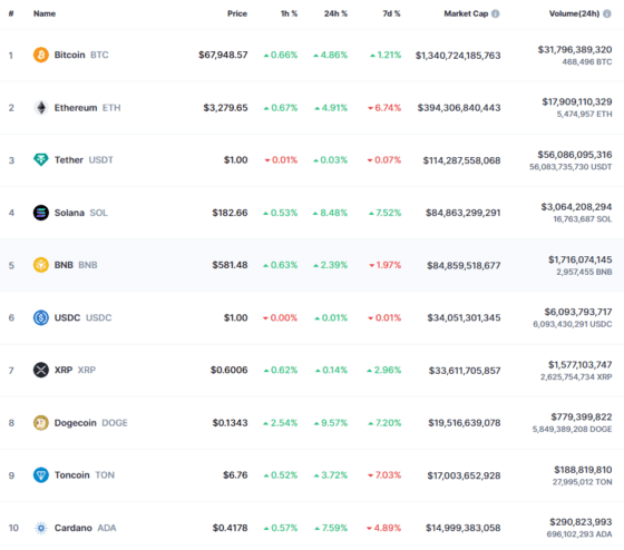 이 시간 비트코인은 코인마켓캡에서 6만7948.57 달러로 24시간 전 대비 4.86% 상승했다. 비트코인은 3월 14일 7만3750.07 달러의 사상 최고가를 기록한 뒤 조정을 겪고 있다. 이더리움은 3279.65 달러로 4.91% 올랐다. 이더리움의 사상 최고가는 2021년 11월 16일 4891.70 달러다.