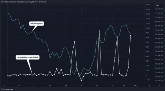 블록체인 분석 회사인 인투더블록(IntoTheBlock)과 트레이딩뷰에 따르면, 비트코인 유통량의 최소 0.1%를 보유한 주소(대형 보유자)들은 7월에 8만4000 BTC 이상, 약 54억 달러 상당의 비트코인을 추가로 매입했다. 이는 비트코인 수량 기준 2014년 10월 이후 가장 큰 월간 매입량이다.