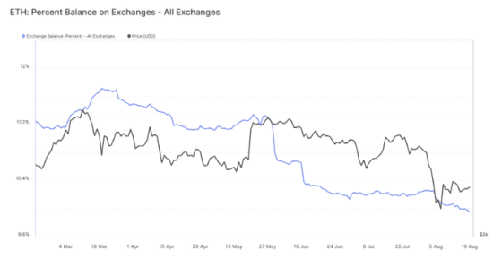 또한, 거래소에 보유된 이더리움의 비율이 계속해서 감소하고 있다. 이는 투자자들의 행동 변화로, 더 많은 암호화폐가 거래소에 보관되면 매도 의도가 있음을 나타내며 가격에 하방 압력을 가할 수 있다.
