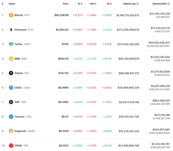 이 시간 비트코인은 코인마켓캡에서 6만308 달러로 24시간 전 대비 1.49% 하락했다. 비트코인은 전일 6만2000 달러 가까이 접근한 뒤 후퇴했다. 비트코인은 3월 14일 7만3750.07 달러의 사상 최고가를 기록한 뒤 조정을 겪고 있다. 이더리움은 2604 달러로 1.28% 내렸다. 이더리움의 사상 최고가는 2021년 11월 16일 4891.70 달러다.