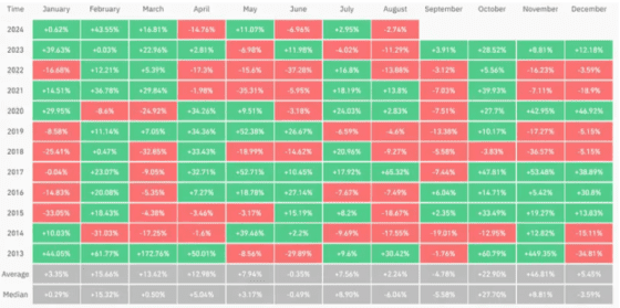 코인글래스 데이터를 인용한 코인데스크의 27일(현지 시간) 기사에 따르면 2013년 이후 비트코인은 9월에 평균 마이너스 4.78% 수익을 기록했다. 이는 월간 기준 최악의 수익률이다. 비트코인은 지난 11년간 9월에 3차례 상승했고 8번 하락했다.