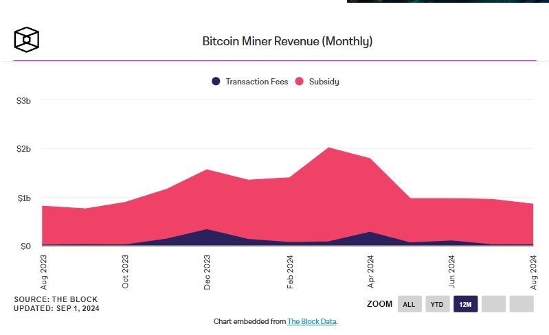 더 블록의 데이터에 따르면, 8월 비트코인 채굴 수익은 총 8억5136만 달러였으며 이 중 2076만 달러가 거래 수수료에서 발생한 것으로 나타났다.