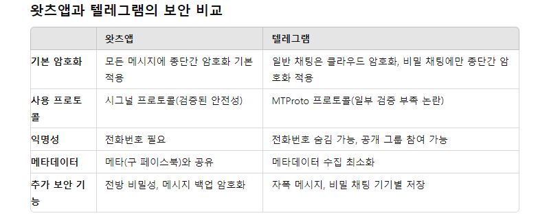 왓츠앱과 텔레그램은 각각 다른 사용자 요구에 맞춘 보안과 프라이버시 기능을 제공하고 있다. 만약 사용자가 △모든 메시지에 대해 기본적인 종단간 암호화와 높은 보안성을 중시한다면, 왓츠앱이 더 나은 선택이 될 수 있다. 왓츠앱은 시그널 프로토콜을 사용해 모든 통신을 암호화하고, 전방 비밀성을 도입해 보안을 강화하고 있다. 다만, 메타(구 페이스북)와의 연관성으로 인한 메타데이터 수집 및 공유 문제가 부담 요인이 될 수 있다.