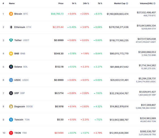 이 시간 비트코인은 코인마켓캡에서 5만8760 달러로 24시간 전 대비 2.05% 내렸다. 비트코인은 지난 주말 상당 시간 6만 달러 위에서 거래됐다. 비트코인은 3월 14일 7만3750.07 달러의 사상 최고가를 기록한 뒤 조정을 겪고 있다. 이더리움은 2311 달러로 3.97% 하락했다. 이더리움의 사상 최고가는 2021년 11월 16일 4891.70 달러다.