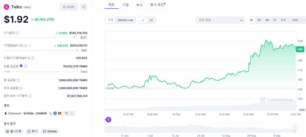 zkEVM 기반 이더리움(ETH) 레이어2 네트워크 타이코(TAIKO)는 전일대비 29.8% 상승한 1.93달러를 기록하고 있다. 거래량은 전날 대비 579% 급증한 2억 달러에 이른다. 타이코의 급등은 비탈릭 부테린이 호평한 영향이 컸다.