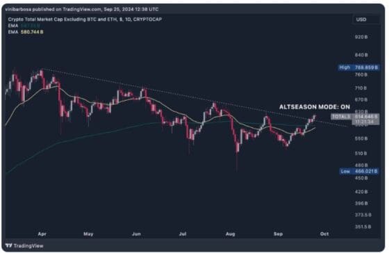 익명의 분석가 크립토 비지(Crypto Busy)는 TOTAL3 지수의 이 같은 돌파를 언급하며 “알트코인 시즌이 다가오고 있다”고 밝혔다.