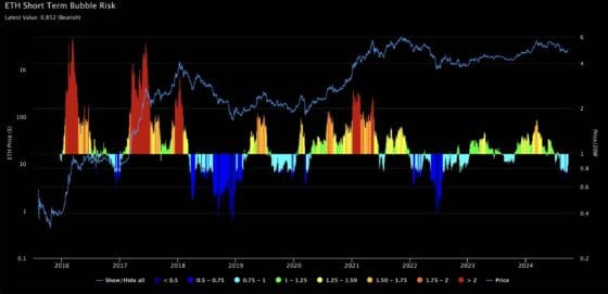 25일(현지 시간) AMB크립토에 따르면, 이더리움의 단기 거품 위험 지표가 하락 약세로 전환됐다. 이는 전체적인 암호화폐 시장의 강세 전망에도 불구하고 이더리움이 단기적인 조정에 직면할 가능성을 시사한다.