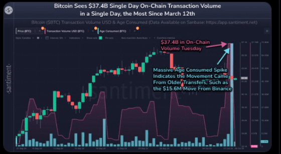 온체인 분석회사 산티멘트는 9일(현지 시간) 엑스(구 트위터)를 통해 “화요일, 비트코인 네트워크에서 오랫동안 활동이 없었던 계정들의 거래가 급증했고 374억 달러의 온체인 거래가 이뤄졌다”면서 “이는 7개월 만에 최고 수준”이라고 밝혔다.