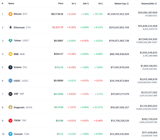 이 시간 비트코인은 코인마켓캡에서 6만7739 달러로 24시간 전 대비 1.18% 상승했다. 비트코인은 간밤과 이날 새벽 한동안 6만8000 달러 위에서 거래됐으며 6만8334.50 달러 고점을 기록했다. 비트코인은 3월 14일 7만3750.07 달러의 사상 최고가를 기록한 뒤 조정을 겪고 있다. 이더리움은 2621 달러로 0.68% 올랐다. 이더리움의 사상 최고가는 2021년 11월 16일 4891.70 달러다.
