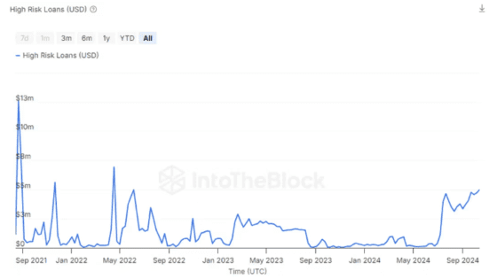 코인데스크는 18일(현지 시간) 인투더블록(IntoTheBlock) 데이터를 인용, 청산 가격의 5% 이내에 있는 위험 대출의 총액이 수요일 기준 5500만 달러에 도달했다고 보도했다. 이는 2022년 6월 이후 최고 수치다.