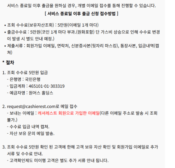다만 서비스 종료일 이후 출금을 원할 경우에 개별 이메일 접수를 통해 보유자산 조회 이후 자산을 돌려받을 수 있다. 이메일 1개마다 조회 수수료도 발생한다. 고객이 보유한 예치자산을 반환받기 위한 절차도 번거로울뿐더러 반환을 위한 추가 비용도 감수해야 한다.