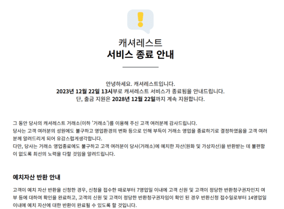 캐셔레스트 공식 홈페이지에는 예치자산 반환에 관한 공지가 올라와 있다. 공지사항에 따르면, “출금 지원은 2028년 12월22일까지 지원한다”고 나와 있다.