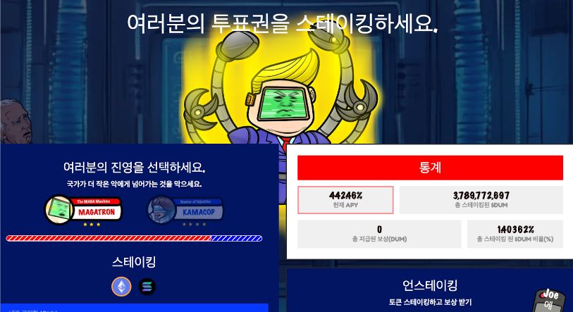 이 프로젝트는 어느 한쪽에 치우치지 않으며, 투자자가 원하는 진영에 참여해 보상을 얻는 구조를 제공한다. 두 가지 스테이킹 풀이 마련돼 있으며, 마가트론 풀의 APY는 442%, 카마캅9000 풀은 1825%로 높은 보상률을 제공한다. 스테이킹 풀 규모가 커질수록 보상률은 점차 감소하도록 설계됐다.