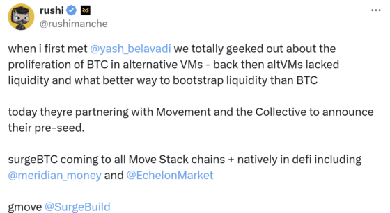 한편, 서지는 지난 10월 17일 무브먼트 랩스의 공동 창립자 루시 만체(Rushi Manche)가 참여한 프리 시드 라운드에서 180만 달러의 펀딩을 완료했다. 루시 만체는 서지와 무브먼트와의 협력을 통해 부족한 유동성을 확보하며 메리디안(Meridian)과 에클론(Echelon)과 같은 디파이에 서지를 이용할 수 있을 것이라 언급한 바 있다.