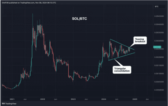 코인데스크는 트레이딩뷰 차트를 인용, 솔라나가 비트코인 대비 수 개월간 이어진 지루한 범위로부터 상방향 돌파의 잠재력을 보여주고 있다고 밝혔다.