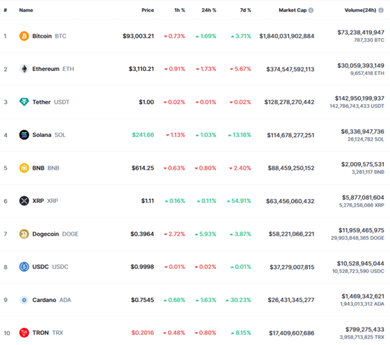 이 시간 비트코인은 코인마켓캡에서 9만3003달러로 24시간 전 대비 1.69% 상승했다. 이날 장중 고점은 9만4002.87달러로 새로운 사상 최고가로 기록됐다. 이전 최고가는 지난 11월 13일 기록한 9만3434.36달러다. 이더리움은 3110달러로 1.73% 후퇴했다. 이더리움의 사상 최고가는 2021년 11월 16일 4891.70 달러다.