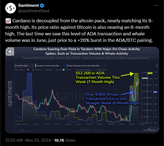이와 같은 거래량과 고래 활동 증가는 비트코인 대비 카르다노(ADA/BTC) 가격 비율이 8개월 만에 최고치에 근접한 것과 맞물려 나타났다. 지난 6월에도 이와 유사한 거래량과 고래 활동의 급증이 목격됐고, 이어 ADA/BTC 비율이 26% 이상 상승했다. 산티멘트는 이런 움직임은 카르다노가 알트코인 시장과 디커플링(탈동조화) 됐음을 나타내는 것이라고 설명했다. 이는 또 카르다노의 강력한 상승 가능성을 시사한다.