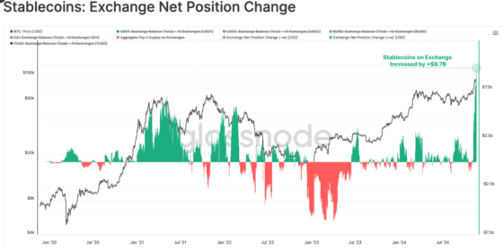 글래스노드(Glassnode)의 데이터를 인용한 온체인 파운데이션(Head of Onchain Foundation)의 리온 와이드만에 따르면, 지난 30일간 암호화폐 거래소로 유입된 스테이블코인은 총 97억 달러에 달하며, 이는 월간 기준 사상 최대 기록이다.