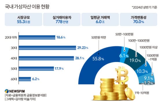 금융위원회 금융정보분석원에 따르면 올해 상반기 기준 국내 가상자산 시장규모는 지난해 하반기(43조6000억원) 대비 27% 증가한 55조3000억원으로 집계됐다. 거래 이용자 수도 같은 기간 644만명에서 778만명으로 21%(133만명) 늘었다.