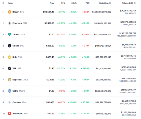 이 시간 비트코인은 코인마켓캡에서 9만3594 달러로 24시간 전 대비 1.25% 상승했다. 비트코인의 전날 저점은 9만770.82 달러로 기록됐다. 비트코인은 11월 22일 9만9655.50 달러의 새로운 사상 최고가를 수립한 뒤 조정을 겪고 있다. 이더리움은 3479 달러로 4.61% 올랐다. 이더리움의 사상 최고가는 2021년 11월 16일 4891.70 달러다.