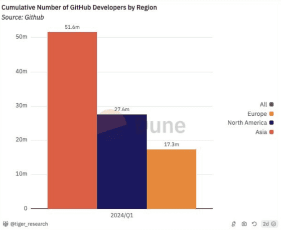 김규진 타이거리서치 대표는 3일 서울 여의도Two IFC 3층 더 포럼에서 열린 블록페스타 2024: Future of Web3 Industry에 참석해 ‘아시아 블록체인 산업의 현황과 미래를 주제를 통해 이같이 밝혔다. 그는 “아시아에는 3억2000만명 이상의 가상자산(암호화폐) 사용자를 보유하고 있고 깃허브에 등록된 개발자 만 5000만명 이상의 아주 큰 시장”이라며 “이는 아시아가 웹3 기술과 블록체인 생태계에서 핵심적인 역할을 하고 있음을 보여준다”고 말했다.