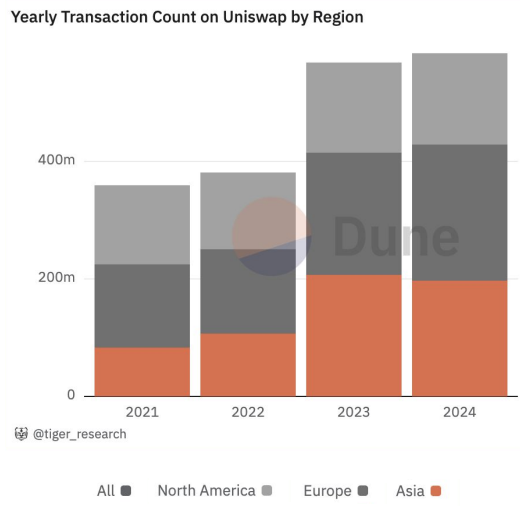 실제 듄 애널리틱스에 따르면 최근 아시아 지역의 유니스왑(UNI) 거래 수는 지속적으로 증가하며, 탈중앙화거래소(DEX・덱스) 거래에서 의미있는 성장을 보였다. 이는 아시아 사용자의 활발한 활동을 반영한 결과로 해당 지역의 가상자산 서비스 이용이 점점 활성화되고 있음을 보여준다.
