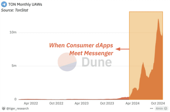 김 대표는 “톤(TON)의 월별 활성 사용자(UAW) 증가세는 디앱과 메신저의 결합이 웹3 대중화를 촉진할 수 있음을 보여주는 대표적인 사례”라며 “이처럼 온체인 데이터를 분석해 시장 상황을 정확히 판단하는 것이 중요하다”고 강조했다.