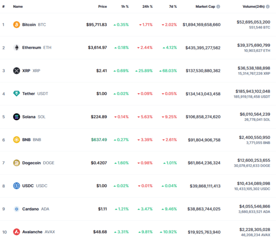 비트코인은 9만5000 달러대에서 움직이고 있고 주말에 급등세를 연출한 XRP는 2.4 달러 부근으로 후퇴, 다지기하는 모습이다. 비트코인이 10만 달러 아래 정체된 가운데 XRP, 카르다노, 아발란체, 체인링크 등 알트코인들이 큰 폭으로 오르면서 비트코인의 암호화폐 시장 도미넌스는 하락 추세다.