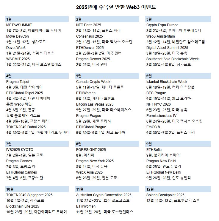 1월에는 아랍에미리트 두바이에서 열리는 ‘METAVSUMMIT’을 시작으로, 스위스 다보스에서 ‘DavosWeb3’가 이어진다. 이어 2월에는 프랑스 파리에서 열리는 ‘NFT Paris 2025’와 미국 덴버에서의 ‘ETHDenver 2025’가 산업 관계자들의 주목을 받을 예정이다.