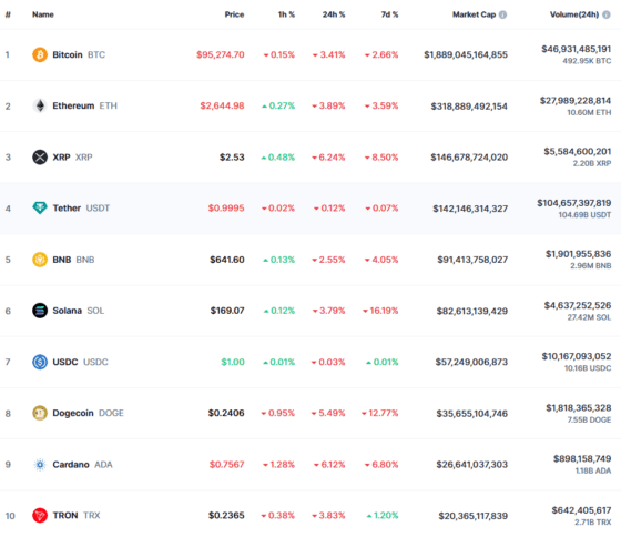 이 시간 비트코인은 코인마켓캡에서 9만5274 달러로 24시간 전 대비 3.41% 내렸다. 이날 장중 고점은 9만9497달러, 저점은 9만5083달러로 기록됐다. 비트코인은 1월 20일 10만9114달러의 새로운 사상 최고가를 찍은 뒤 조정을 겪고 있다. 이더리움은 2644달러로 3.89% 떨어졌다. 이더리움의 사상 최고가는 2021년 11월 16일 기록한 4891.70달러다.