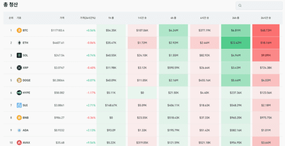 이외에도 HYPE, SUI, BNB, ADA 등에서도 크고 작은 청산이 발생하며 시장 내 단기 포지션 조정이 활발하게 일어났다. HYPE는 1234만달러, SUI는 1210만달러, BNB는 979만달러, ADA는 943만달러의 청산 규모를 각각 기록했다.