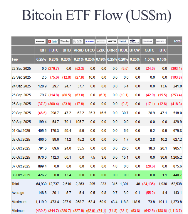 ETF 시장에서는 관망 기조가 일부 나타났다. 파사이드인베스터스에 따르면 8일(현지시각) 기준 비트코인 ETF에는 4억4026만 달러의 순유입이 발생했으나, 직전일(7일)의 8억9994만 달러 대비 유입 강도는 줄었다. 이더리움 ETF도 같은 날 1489만 달러 순유입되며 누적 20억 달러에 근접했지만, 일부 상품에서는 자금 유출이 동반됐다.