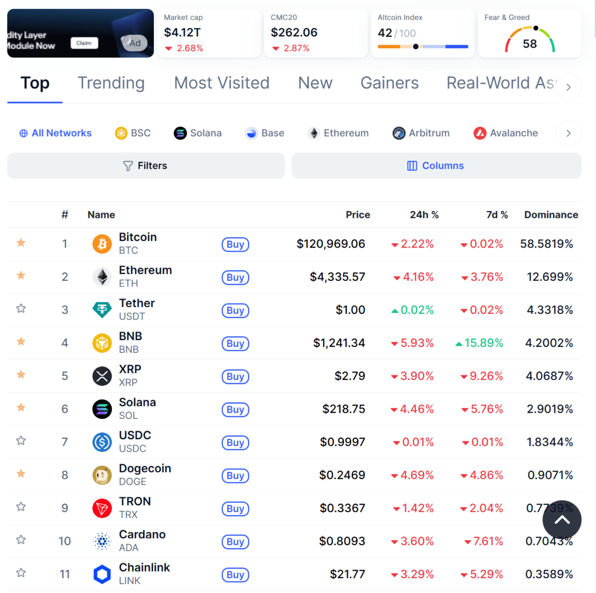 9일 오후 4시 34분(현지시각) 기준 디지털자산 전체 시가총액은 전일 대비 2.68% 줄어든 4조1200억 달러를 기록했다. 비트코인 도미넌스는 58.58%로 상승하며 대형 자산으로의 회귀 흐름을 보였고, 이더리움 도미넌스는 12.7% 수준이다.