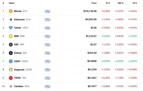 11일 5시 기준 코인마켓캡에 따르면, 비트코인(BTC)은 전일 대비 3.57% 하락한 11만 6,739달러에 거래되고 있으며, 최근 고점이었던 12만 2,000달러 선에서 크게 후퇴했다. 이더리움(ETH)은 7.85% 급락해 4,003달러까지 내려앉았고, 솔라나(SOL)는 5.87% 하락하며 205.56달러를 기록했다. 이들 주요 종목은 모두 10월 초 가격 수준으로 되돌아가며 사실상 월간 상승분을 반납한 상태다.