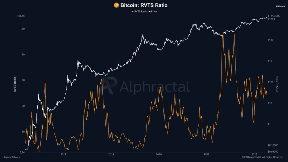 19일 온체인 분석업체 알프랙탈(Alphractal)에 따르면, 비트코인의 RVTS 비율은 최근 몇 주 사이 가파른 하락세를 보이며 장기 박스권 하단을 향해 근접하고 있다. RVTS는 비트코인의 실현 시가총액(Realized Value) 대비 조정된 온체인 거래량(Adjusted Transaction Volume)의 비율로, 네트워크 내에서 실제 얼마나 많은 자금이 ‘이동’하고 있는지를 나타내는 지표다.